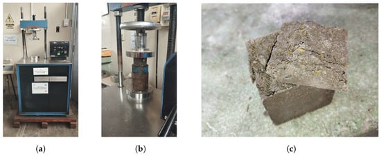 Sixty cubic samples of mortars were tested according to ASTM C109/C109M [], at curing ages of 4, 7, 14, and 28 days, as shown in Figure 12.