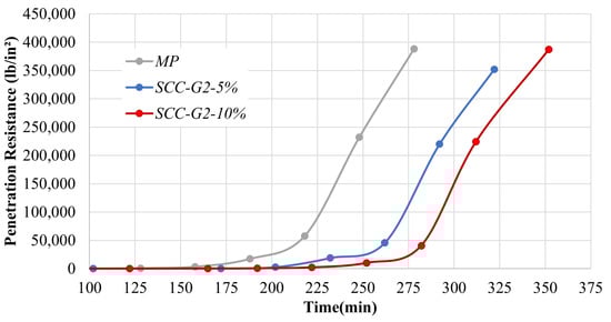 Applying the ASTM C403/C403M [], the setting time of the mortar with the addition of SCC was determined for SCC-G2-5% and SCC-G2-10%, because these had the best performances in flowability, workability, and resistance from the eight studied designs as per Table 7. The initial setting was observed at 119 min, and the final setting occurred at 155 min for the standard mortar (PM). For the SCC-G2-5% and SCC-G2-10% designs, the initial setting times were 135 and 168 min, respectively. Additionally, the final setting times for these two designs were 184 and 215 min, respectively. It is noted that the setting time increased with the introduction of SCC, as shown in Figure 13, due to the slower response compared to cement hydration [].