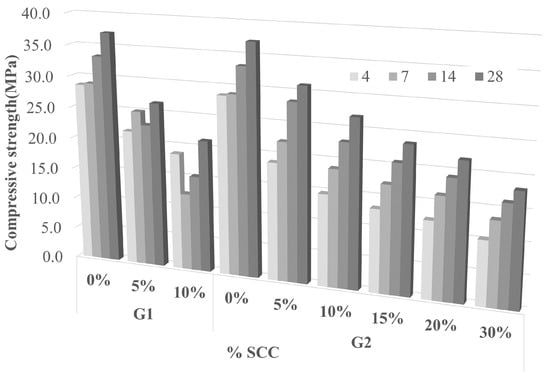 The data indicate that the age of the mortar and the proportion of SCC are significant factors in the strength of the material. In addition, the finer the particle size of the SCC aggregate, i.e., with G2, the better the results obtained at 28 days of curing [] as shown in Figure 14.