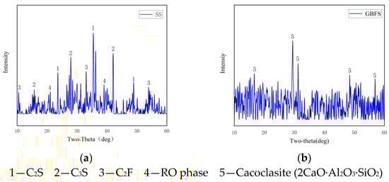 The origins of the steel slag and slag were Zhengzhou City, Henan Province, and Yingkou City, Liaoning Province, respectively. The materials were firstly mechanically ground in the laboratory by ball mill and then analyzed for their mineral compositions by XRD; the results are shown in Figure 1. The figure illustrates that the mineral-phase composition of the steel slag primarily consisted of the C2S, C3S, C2F, and RO phases. In contrast, the mineral-phase composition of the slag was mainly calcium–aluminum yellow feldspar, with the chemical molecular formula of CaO-Al2O3-SiO2. At 60 min after the steel slag was milled, desulfurization gypsum was added to it, and it was then mixed and milled for another 20 min to ensure that the desulfurization gypsum had an effect on the chemical activation of the steel slag micropowder and the mineral phase of the slag. For the chemical activation of the steel slag micropowder, the gypsum used was construction gypsum from a company in Shenyang [,,]. Table 2 shows the chemical compositions of the steel slag, slag, magnesium oxide, and desulfurization gypsum, as determined by X-ray fluorescence spectrometry (XRF). The magnesium oxide used was from a company in Yingkou, Liaoning Province, the sodium carbonate was from a company in Jiaxing, Zhejiang Province, and the purity was analytically pure. The water-reducing agent was the Nai system water-reducing agent from a company in Shanghai.