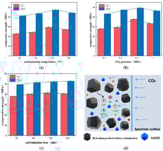 The main reason for this phenomenon is that the carbonation temperature is directly proportional to the rate of carbon dioxide diffusion and the hydration reaction rate of the cementitious system, which generates more carbonate precipitate (the main component is CaCO3) carbonate, which can fill the pores of the cementitious system, reduce the porosity, and thereby make the structure denser, which improves the mechanical properties of the cementitious system (as shown in Figure 3d) []. When the carbonation temperature reaches 90 °C, the carbon dioxide solubility will not only reduce the water in the cementitious system but will also cause the rapid evaporation of water in the cementitious system; in the above two cases, in the macro-performance of the cementitious material, the mechanical properties decline [].