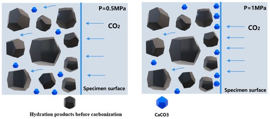 This is because the carbon dioxide pressure is proportional to the leaching efficiency of the relevant ions in G40, which promotes the generation of hydration products, such as C-S-H gels, calcites, and magnesites. This is manifested macroscopically in the enhancement of the mechanical properties. It is worth noting that G40 showed a decrease in strength at a CO2 pressure of 1 MPa. This is because the carbonation reaction was “from the outside to the inside” step by step, and a too-high carbon dioxide pressure will make the reaction too fast in the cementitious material surface and generate a layer of dense “protective film”. Although the existence of the protective film will reduce the porosity and improve the mechanical properties of the cementitious system, it will also prevent the further diffusion of carbon dioxide, hindering the further carbonization reaction within the cementitious system (as shown in Figure 4) [,].
