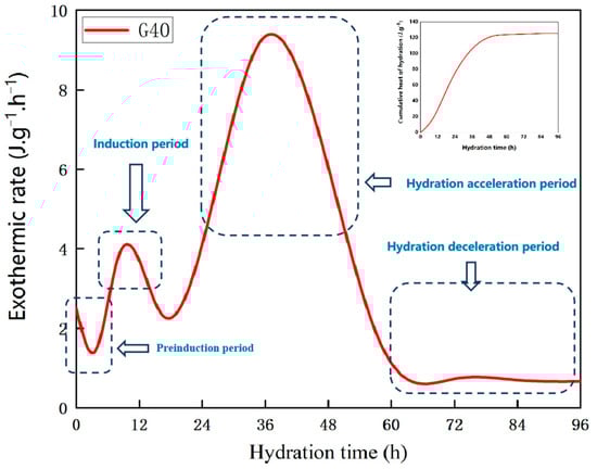According to the influence of steel slag doping on the strength of the steel slag-based cementitious materials, comparing G60 and G40, there was up to a 47% decline in the strength. An isothermal calorimeter was used to measure the heat of hydration of the steel slag-based cementitious materials at G40, as shown in Figure 5, where it can be observed that there are three major exothermic peaks of the exothermic curve of the steel slag-based cementitious materials.