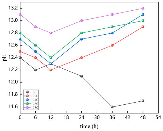 Under the premise of standard maintenance, 10 g of cementitious material was placed into a conical flask, and then 50 mL of ultrapure water was added to determine the pH value of the upper layer of the clear liquid at different reaction ages.