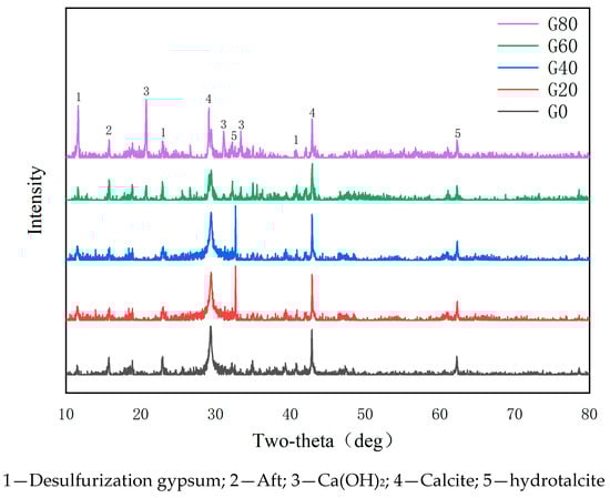 As shown in Figure 7, the main diffraction peaks of the hydration products of the steel slag-based cementitious materials with different steel slag dosages were the desulfurized gypsum phase, AFt phase, calcium hydroxide phase, calcite phase, and hydrotalcite phase. The calcium hydroxide diffraction peaks appear because steel slag contains a large amount of calcium oxide, which reacts with water to form calcium hydroxide (see Equation (3)). The appearance of desulfurization gypsum and AFt diffraction peaks is because the addition of desulfurization gypsum introduces sulfate ions, and the sulfate ions can be dissociated with the slag meta-aluminate ions reacted to form AFt (see Equations (4)–(6)), and when the amount of slag mixing is too small, the slag dissociation of the meta-aluminate is insufficient, which will affect the generation of calcite crystals []. Calcite appears because the addition of sodium carbonate introduces carbonate ions into the gelling system, which generate calcium carbonate with calcium ions in the gelling system, and calcium carbonate exists in the gelling system as the main component of calcite. The appearance of the hydrographite phase is because magnesium oxide can react with water to form the hydrographite phase, the magnesium ions in the hydrotalcite phase are replaced by aluminum ions with similar radii, and the hydrotalcite phase is formed under the action of carbonate ions and other factors [].