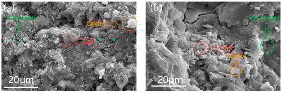 In addition, it can be seen from Figure 9 that, at 3 d, the generation of calcite provided generating sites for the subsequent generation of calcite and C-S-H gels. With the increase in age, calcite and C-S-H gels were generated in large quantities and overlapped and interspersed with AFt, which enhanced the mechanical properties of the gelling system [,]. In addition, the generation of the hydrated fossil phase plays a role in accelerating the transformation of the carbonate phase in the cementitious system, such as the transformation of oblique soda-lime to calcite, which improves the late strength of the cementitious system.