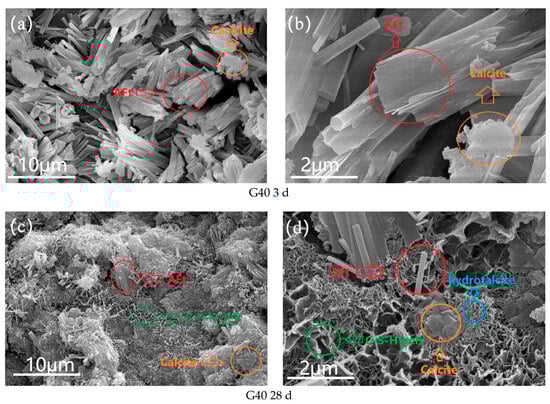 SEM images of steel slag-based cementitious materials at 3 d and 28 d with 40% steel slag: (a,b); G40-3 d, (c,d); G40-28 d.