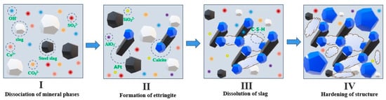 Therefore, the hydration process of steel slag-based cementitious materials can be initially divided into four stages: mineral-phase dissociation, AFt generation, slag dissociation, and structural hardening (as shown in Figure 10).