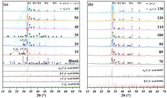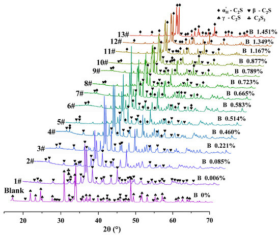 X-ray diffraction of C2S doped with different content levels of boron. (a) Samples blank–6# and (b) samples 7#–13#.