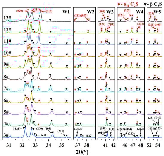 The characteristic diffraction peaks of β-C2S and α′H-C2S can be divided into five window regions, denoted as W1–W5, which are displayed in Figure 3. These window regions include the following angles: 30.5°–35.7°, 36.5–39°, 40°–42.2°, 45°–48.5°, and 51.5°–55°. Detailed comparisons are conducted by extracting the diffraction peaks within these regions, as illustrated in Figure 4. From an overall perspective, the diffraction peaks of samples 3#–5# exhibit the characteristics of β-C2S primarily due to the relatively small amount of α′H-C2S formed, which is not prominently reflected in the XRD pattern. In samples 6#–10#, with an increase in the boron solid solution content, the formation of α′H-C2S gradually increases, accompanied by more pronounced diffraction peaks, especially in the 32°–33° characteristic diffraction region. In samples 11#–13#, the XRD diffraction peaks are mainly attributed to α′H-C2S, with 13# showing almost no diffraction peaks of β-C2S. This indicates that at this stage, C2S has transitioned almost completely from the β phase to the α′H phase.