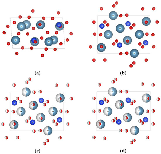 Simulation of the transformation process from β-C2S unit cell to α′H-C2S unit cell using VESTA software. (a) β-C2S unit cell observed along the b-axis; (b) β-C2S unit cell after transformation using the transformation matrix P, observed along the b-axis; (c) modified unit cell after transformation, with adjusted symmetry (space group Pnma) and Ca/O occupancies set to 0.5, observed along the b-axis; and (d) α′H-C2S unit cell observed along the b-axis. (The red or partially red and white spheres represent oxygen atoms. The deep blue spheres represent silicon atoms. The light blue or partially light blue and white spheres represent calcium atoms).