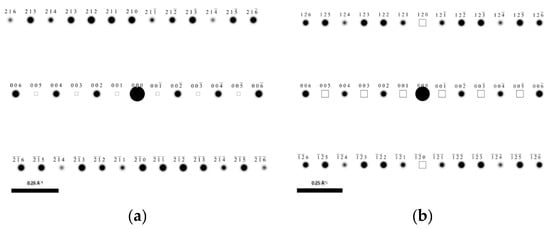 Simulated diffraction patterns for the zone axis and . (a) and (b) . (The circles represent diffraction spots while the squares represent forbidden diffraction).