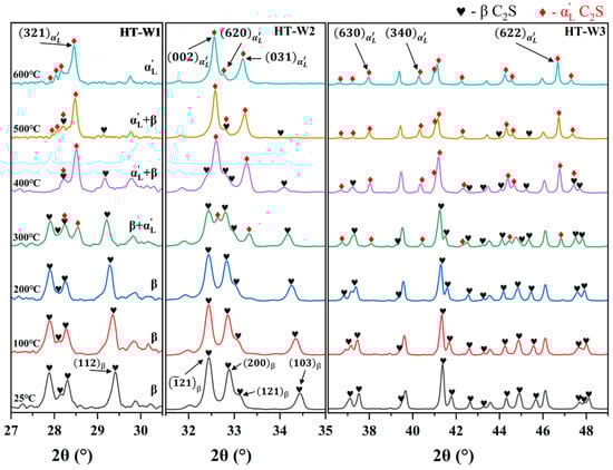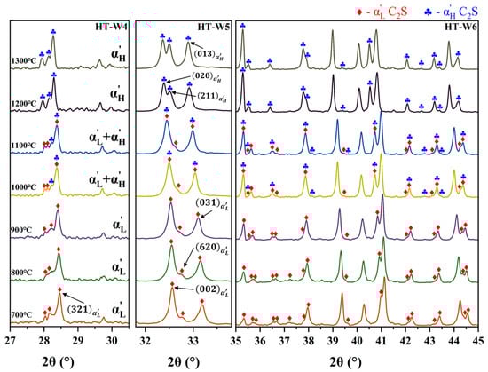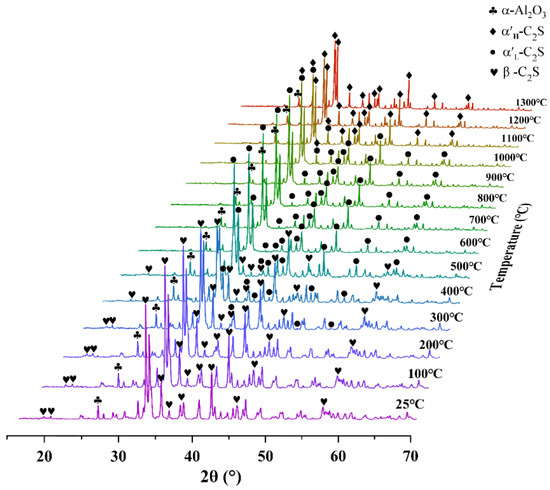 High-temperature XRD analysis was conducted using the same device as for RT-XRD, while the test parameters are given in Table 3. The heating process was controlled at a rate of 10 °C per minute. Data collection commenced when the temperature reached 100 °C and data points were recorded every 100 °C, while maintaining a constant temperature. The standard reference cards used for qualitative phase analysis were α-C2S (ICSD No. 82,998) [36], α′H-C2S (ICSD No. 82,997) [36], α′L-C2S (ICSD No. 82,996) [36], and β-C2S (ICSD No. 81,096) [34].