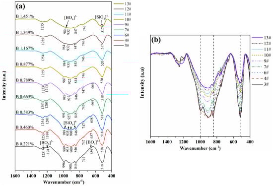 Based on the XRD results obtained at room temperature and high temperature, it is evident that the incorporation of boron can effectively transform β-C2S into the α′H phase. However, further investigation is needed to determine the specific occupancy and substitution behavior of boron within the C2S structure. From the samples 3# to 13#, a total of 9 samples were selected for FT-IR testing based on the variation in boron content. The results are presented in Figure 10. Figure 10a indicates the absorption peak signals of the major functional groups. The absorption peaks observed at around 1250 cm−1, 1200 cm−1, and 660 cm−1 are attributed to the stretching vibrations of [BO3]3− ions. The asymmetric stretching vibration absorption peaks of [BO4]5− ions are observed in the range of 1080 cm cm−1 to 950 cm−1 [30]. The asymmetric stretching vibration absorption peaks of V3 [SiO4]4− ions are observed in the range of 996 cm−1 to 846 cm−1, while the asymmetric bending vibration absorption peak of V4 [SiO4]4− ions is observed at around 518 cm−1 [28,29,30,31].