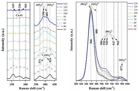 Nine samples ranging from 3# to 13# were selected for Raman spectroscopy analysis, which was the same as for the Fourier-transform infrared (FT-IR) spectroscopy. The resulting data is presented in Figure 11. Within the frequency range of 300–50 cm−1, the vibrations arise from the lattice’s internal components and are primarily attributed to the presence of Ca-O bonds [39]. There is a progressive attenuation in the vibrations of Ca-O observed at 165 cm−1, 236 cm−1, and 303 cm−1 as the boron content increases. This suggests that during the conversion process from β-C2S to α′H-C2S, B3+ replaces Ca2+ ions. This observation corroborates the indications from the FT-IR spectroscopy analysis regarding the α′H-C2S structure. The symmetric bending vibrations of V2 [SiO4]4− are observed at 371 cm−1 and 424 cm−1 [39,40,41]. As the boron content increases, [BO4]5− gradually replaces [SiO4]4−, resulting in an interaction between the two which produces an overlapping vibration peak at 390 cm−1 and 405 cm−1. Similarly, the overlapping vibration peaks at 846 cm−1 and 880 cm−1 are attributed to [BO4]5− and [SiO4]4− [42]. It is evident that starting from sample 10#, the peak at 846 cm−1 significantly broadens, indicating an enhanced role of [BO4]5− in the structure. This observation is consistent with the significant weakening of the characteristic absorption peak of [BO3]3− in the FT-IR spectroscopy results from sample 10#. The symmetric stretching vibrations of [BO4]5− are observed in the range of 962 cm−1 to 900 cm−1, and, starting from sample 10#, there is a noticeable enhancement in these vibrations, indicating a gradual increase in the content of [BO4]5−. The attenuation of the vibration peak at around 977 cm−1 of [SiO4]4− further confirms the substitution of [BO4]5− for [SiO4]4−.