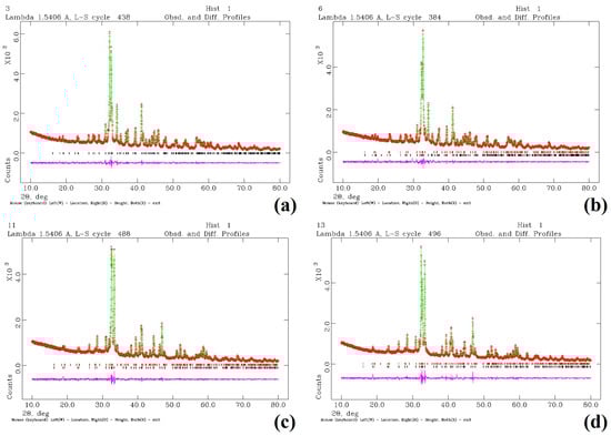 Fitting graph for quantitative calculation of the sample. (a) 3#; (b) 6#; (c) 11#; and (d) 13# (The black stripes represent β-C2S, while the red stripes represent α′H-C2S).
