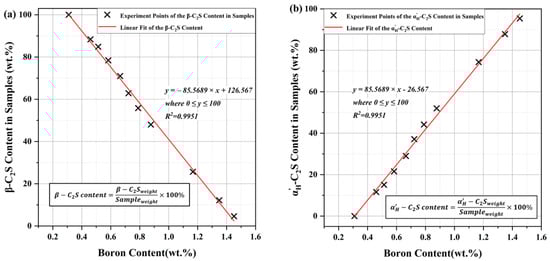 The linear fitting of the boron and C2S content. (a) Boron vs. β-C2S and (b) boron vs. α′H-C2S.