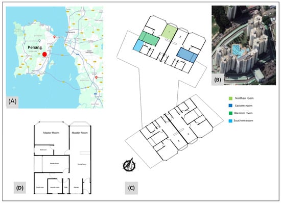 Details of the case study: (A) location map, (B) the six blocks of the condominium, (C) layout of each building, (D) floor plan of each unit.
