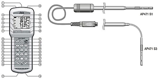 In Figure 4, environmental factors are measured using the DO 9847K instrument, which is manufactured by Delta Ohm Srl. This Italian datalogger has the capability to assess airspeed, moist bulb temperature, air temperature, relative humidity, and globe temperature. Additionally, medium radiant temperature (Tr), predicted mean vote (PMV), predicted percentage dissatisfied (PPD), and damp bulb globe temperature (WBGT) can be determined from measured quantities, following ISO 7243, ISO 8996, ISO 7726, and ISO 7730 standards as cited in ref. []. A detailed listing of its features can be found in Table 3.