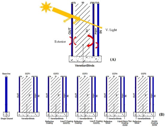 Integrated Venetian blinds are preferred as shading elements within the cavity because of their adjustable rotation angle, providing users with increased control over shading conditions. In the initial group (CCFD1), the systems include uncoated glass panes. In the subsequent groups (CCFD2 and CCFD3), a high-performance coating with a Tvis/Tsol ratio of 53/57 and 72/57 Low-E, along with a reflective coating, is applied to reduce the solar radiation entering the CCF cavity. The fourth group (CCFD4) utilizes a high-performance Liquid Nanotinted coating, specifically designed to deflect solar rays and prevent the excessive heating of the CCF cavity. The fifth group (CCFD5) closely resembles the fourth group, incorporating an acrylic high-performance coating to achieve comparable performance.