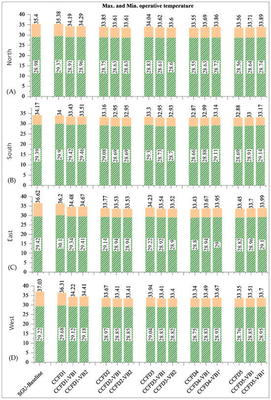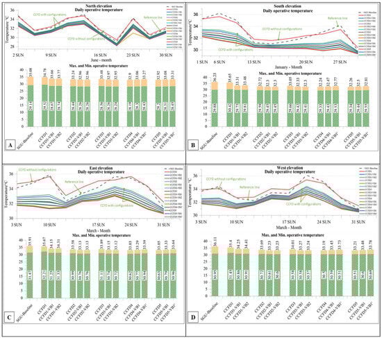 On the north elevation, as shown in Figure 8A, the application of CCFDs led to a noticeable reduction in daily peak operative temperatures at the various configurations. Particularly noteworthy is the preference for CCFD2, where the recorded average monthly peak temperatures for this configuration range from 28.26 °C to 32.96 °C, which are markedly lower than the reference case peak of 35.08 °C. Turning to the southern façade (Figure 8B), the CCFD2 configuration also exhibits a pronounced temperature moderation effect. The average monthly operative temperature peaks for the south-facing CCFD configurations were recorded between 29.45 °C and 32.3 °C. This range is significantly lower than the reference case, which stands at 36.23 °C. Given that the southern façade often receives the most substantial amount of solar radiation throughout the year, the reduction in peak temperatures here is particularly beneficial. For the eastern façade, as shown in Figure 8C, the CCFDs show a reduction in the monthly peak temperatures, with values ranging from 30.76 °C to 33.13 °C, compared to the reference condition peak of 35.91 °C. Similarly, the western façade (Figure 8D), which is subject to high afternoon temperatures, sees a reduction in peak operative temperatures with CCFD2 implementation, with values varying from 30.61 °C to 33.23 °C, in contrast to the reference condition’s peak of 36.11 °C. This indicates that the CCFDs are capable of reducing the thermal load during the later parts of the day when the sun is at its most intense. In summation, the CCFD2 in both configurations, CCFD2-VB1 and CCFD2-VB2, has shown a consistent pattern of reducing peak operative temperatures across all façades when compared to the SGU baseline. The data suggest that the integration of CCFDs can be an effective passive cooling strategy, contributing to the reduction of cooling loads and enhancing the indoor environmental quality for occupants.