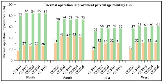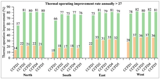 Annual daily average of operating temperature improvement percentage across north, south, east, and west Façade s for CCFDs.