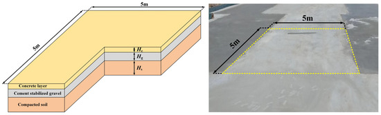 Airport runway is a typical composite concrete structure [11], which is generally composed of multiple composite concrete structures of the same size. A common single block of airport runway has a side length of 5 m × 5 m, and the concrete layer thickness is generally 200 mm–500 mm. Therefore, a composite concrete structure was built as shown in Figure 1, divided into a concrete layer, a cement stabilized gravel layer, and a compacted soil layer, with each layer measuring 5 m × 5 m.