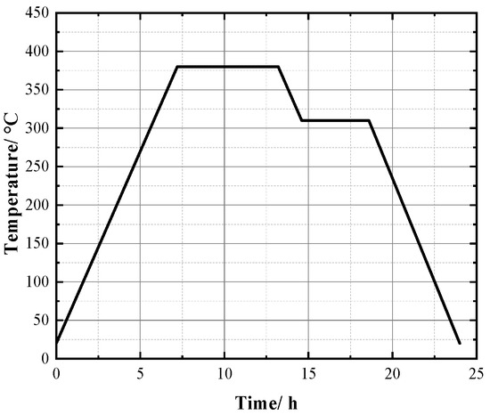 The PTFE/Al reactive material not only possesses a certain mechanical strength but also releases chemical energy under impact. The reactive liner is crushed under the detonation of shaped charges and forms a jet internally and a slug externally, creating a significant velocity gradient across the reactive jet, which leads to jet stretching. Studies have shown [20,26] that the reaction of the reactive jet is a typical process of force-thermal-chemical coupling. The decomposition of the matrix material requires time, and there needs to be a certain growth process for the reaction between the decomposition products and the aluminum powder before a violent explosion occurs. This means that the explosive reaction of the reactive jet is delayed, which allows it to form a jet on a macro scale and utilize its kinetic energy for penetration. The reaction delay time, τ, is the interval between the impact on the reactive liner and the instantaneous violent explosion. The chemical reaction of the reactive jet before this delay time is often disregarded, assuming the reactive jet is completely inert before its delay time, τ, and explodes instantaneously when the time reaches τ. The reactive liner material used in this study consisted of a mixture of 73.5% PTFE (DuPont, type MP 1500 J, Wilmington, DE, USA) and 26.5% Al (Hunan Goldsky Aluminum Industry High-Tech Co., Ltd., Changsha, China, JT-4), with a density of approximately 2.27 g/cm3 and a total mass of 1080 g. The preparation process was divided into three steps: (1) Powder Mixing: After initial mixing, the powder was further mixed in a special ball mill for three hours, then the thoroughly mixed powder was dried in a vacuum oven at 82 °C for about 24 h; (2) Cold Pressing: The required mass of the reactive material for the liner was calculated, the mixed and dried powder material was weighed, poured into a prepared mold, and pressed under a pressure of 300 MPa for 30 s. The cold-pressed liner sample was then left under an ambient pressure and temperature for 24 h to remove any internal air and residual stress; (3) Sintering: The cold-pressed liner sample was placed in a nitrogen-filled sintering furnace for sintering. The sintering temperature curve is shown in Figure 2 [27], with a maximum temperature of 380 °C, and the liner sample was cooled to room temperature in the furnace afterwards.