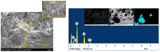 The reactive liner samples were subjected to Scanning Electron Microscope (SEM) imaging and Energy Dispersive Spectroscopy (EDS) elemental analysis, with the results shown in Figure 3. The EDS surface scan elemental analysis results are presented in Table 3. After magnification by 250 times under the SEM, it was observed that the interfaces between the PTFE particles disappeared after sintering, forming a continuous hole, which enhanced the mechanical properties of the material. The PTFE matrix encapsulated Al particles, with the aluminum particles having an approximate diameter of 30 μm. According to the results of the elemental analysis by EDS scanning, besides carbon (C), fluorine (F), and aluminum (Al), the sample also contained a small amount of oxygen. This was attributed to the formation of a dense oxide layer on the surface of the aluminum powder upon contact with air.