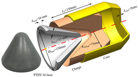 The experimental reactive liner shaped charges consisted of a reactive liner, the main charge, and a case. Common shapes of the liner included conical, trumpet, and spherical. The cone angle of the shaped charge liners is generally selected from 50° to 80° [28]. For this paper, a conical reactive liner with a cone angle of 60° was selected. The structure of the reactive liner samples and the shaped charge are illustrated in Figure 4. The structure of the shaped charge was a cylinder with a boat tail. The main charge was fabricated by pressing the 8701 explosive with a density of 1.70 g/cm3. The material of the case was Steel 1006.The parameters of the shaped charge structure are listed in Table 4, detailing the length of the charge (Lc), the charge radius (Rcharge), the case thickness (δcase), the liner thickness (δliner), the liner step thickness (δstep), the liner diameter (Øliner), the outer radius of the liner (Router), the inner radius of the liner (Rinner), the cone angle of the liner (θ), and the boat tail angle of the charge (θB).