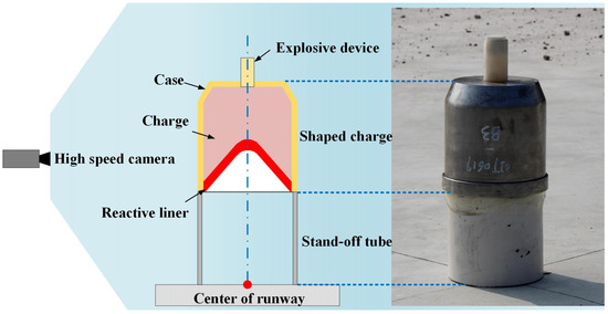 According to research results by Baker [21], the optimal stand-off of the reactive liner shaped charge should be selected as 0.5~1.5 times the charge diameter; 1.0 times the charge diameter was selected as the stand-off in this paper. The experimental principle and setup are depicted in Figure 5, positioning the shaped charge on a stand-off tube at the center of the composite concrete structure, with a stand-off of 150 mm. The shaped charge was detonated at the central point using a detonating device. A total of three experimental groups were conducted, with concrete layer thicknesses set at Hc = 250 mm, 350 mm, and 450 mm, respectively. Additionally, to compare the damage effects of the reactive jets versus the inert jets, a control experiment using an Al liner shaped charge was performed on a Hc = 450 mm composite concrete structure. The Al liner shaped charge was of the same mass as the reactive liners, with all other experimental conditions kept constant. The experimental process was recorded using a high-speed camera (Phantom V 1612, Vision Research, Inc., Wayne, NJ, USA), capturing at a frame rate of 16,000 frames per second and an image resolution of 1280 × 800 pixels.