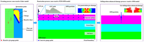 Numerical modeling is a critical procedure in determining the accuracy of computational results. Current mainstream computational methods primarily include the Lagrange algorithm, the Euler algorithm, the ALE (Arbitrary Lagrangian Eulerian) algorithm, the CEL (Coupled Eulerian–Lagrangian) algorithm, and the FEM-SPH (Finite Element Method-Smoothed Particle Hydrodynamics) coupling algorithm. Each of these methods has its advantages, considering the specific requirements of the simulation. The Euler algorithm is frequently used in simulating fluids, gases, and large deformation problems, such as jet formation from shaped charges. The FEM-SPH algorithm is particularly effective for calculating jet or projectile penetration in brittle materials, offering a more accurate description of brittle material fracture and large deformation in solids. The challenge of dynamic damage in composite concrete structures under combined penetration and explosion actions involves complex force–thermal–chemical coupling and deformation and fracture under high dynamic loads. Therefore, different computational methods were employed at various stages to address these challenges, as illustrated in Figure 6.
