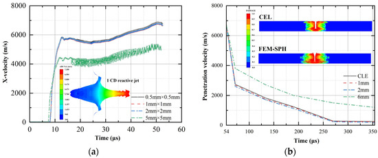 To ensure computational accuracy while minimizing the grid size, a comprehensive grid convergence analysis was conducted. During the formation stage, grid sizes of 0.5 mm × 0.5 mm, 1 mm × 1 mm, 2 mm × 2 mm, and 5 mm × 5 mm were evaluated, with the velocity of the jet tip over time illustrated in Figure 7a. It was observed that, with a grid size of 5 mm × 5 mm, a significant distortion in the jet tip velocity occurred, indicating a loss of detail and precision. To further refine the analysis, target particle sizes of 1 mm, 2 mm, 4 mm, and 8 mm were compared, alongside velocity changes of the jet head during penetration. This comparison was benchmarked against the CEL method using a 2 mm × 2 mm grid. The findings revealed that grid sizes smaller than 2 mm exhibited good convergence, suggesting a balanced approach between computational efficiency and accuracy. Based on these results, the grid sizes specified in Section 2.3.2. were deemed appropriate for the ensuing computations, ensuring both precision and practicality in the numerical simulations.