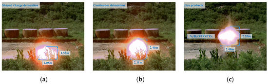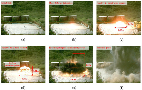 Formulas (6) through (8) suggest that, after the reaction of the reactive jet, a significant amount of solid carbon (C) was produced, signifying that an explosive reaction occurred in the penetration hole. By t = 30 ms, the carbon dispersed with the smoke, and fragments of the damaged concrete layer and base material were ejected.