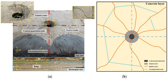 Dynamic damage results of the Hc = 250 mm composite concrete structure due to reactive jet impact: (a) Experimental results, (b) Damage diagram.