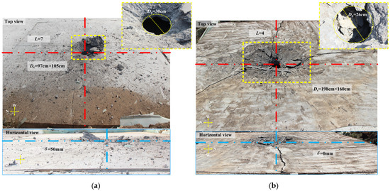 Experiments were conducted on composite concrete structures with thicknesses of Hc = 350 mm and Hc = 450 mm, under identical experimental conditions, with the results presented in Figure 10. The results indicated that, for an Hc = 350 mm thickness, the concrete layer exhibited seven radial cracks penetrating through, with the Dc measuring 97 cm × 105 cm, and δb = 3 cm. When the thickness was increased to Hc = 450 mm, the concrete layer developed four radial cracks, with the Dc expanding to 198 cm × 160 cm; no observable bulge was noted. Comparing Figure 9 and Figure 10 revealed that, as the thickness of the concrete layer increased, the Dc gradually enlarged yet the L and the δb tended to decrease.