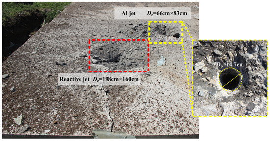 An experiment was conducted using an Al liner to damage a composite concrete structure with Hc = 450 mm thickness under identical experimental conditions. Since the Al jet was an inert jet, no explosion reaction occurred during the penetration process. In order to make a more intuitive damage comparison and save costs, the experiment was continued on an intact portion of the composite concrete structure, where the Hc = 450 mm experiment with the reactive jet was conducted. It is noteworthy that, although the Al jet experiment was conducted on an intact portion of the composite concrete structure, this structure had already sustained damage during previous experiments. Moreover, the Al jet test was conducted closer to the boundary, which might have introduced a stronger boundary effect reflection gain. However, the damage resulting from the Al jet was still significantly less than that caused by reactive jets under the same conditions, aligning with the findings by Baker et al. [21].