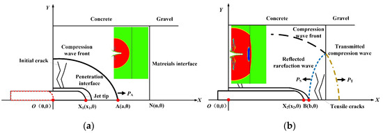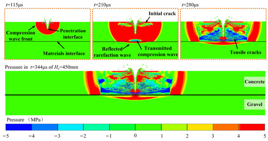 The dynamic response of the composite concrete structures subjected to reactive jet penetration is depicted in Figure 13. During penetration, the concrete at the penetration interface was damaged by jet compression, at the same time, the concrete medium near the axis of symmetry fractured under the combined action of the radial and circumferential tensile stresses, resulting in the formation and expansion of microcracks. Figure 13a illustrates the initial state of the jet penetration and compression wave propagation.