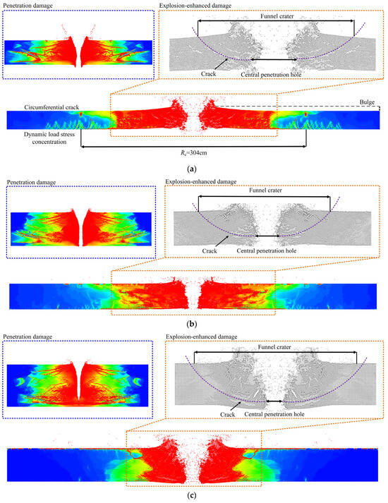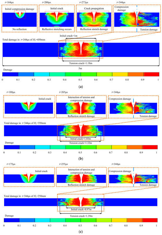 Numerical simulation results of explosion-enhanced damage: (a) Hc = 250 mm, (b) Hc = 350 mm, (c) Hc = 450 mm.