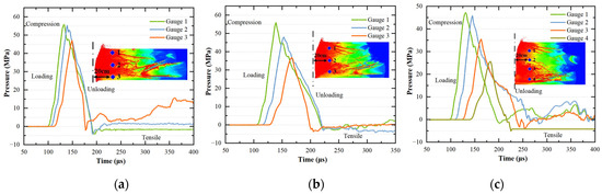 During the penetration process, the pressure changes at the gauge points that were 20 cm from the penetration center within the concrete are illustrated in Figure 16. Initially, the concrete was subjected to the penetration of the jet, causing an immediate increase in the internal pressure and compressive damage. Following this, the pressure decreased under the effect of the reflected rarefaction waves. When the pressure dropped below σt, the concrete went through tensile damage. Subsequently, the pressure within the target fluctuated under the combined action of penetration compression and reflected tension.