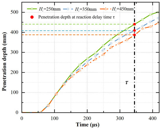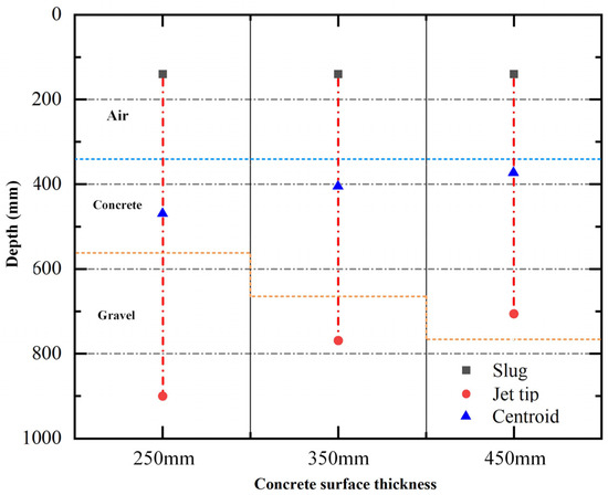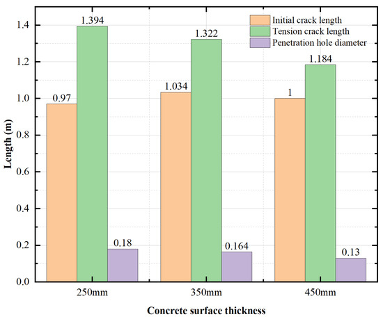 Upon reaching the reaction delay time, τ, the penetration depth of the reactive jet is shown in Figure 17, and the damage results of the concrete layer are presented in Figure 18. At the reaction delay time, τ, as the thickness of the concrete layer increased, the length of tensile cracks on the back side and the diameter of the penetration hole gradually decreased, while the lengths of the initial cracks on the front side remained essentially consistent. According to Equation (13), under identical conditions, the initial cracks on the front side depended solely on the impact pressure, P0, hence the consistency in the crack length. Conversely, the lengths of the cracks on the back side correlated with the tensile pressure, Ps. As the thickness of the concrete layer increased, it took longer for the compression wave to reach the reflective interface. Within the same reaction time, the shorter duration of action by the reflective pressure, Ps, resulted in lesser tensile damage on the back side, leading to shorter crack lengths.