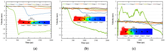 From Equations (14) and (15), it is evident that the δb was directly proportional to the mass of the reactive material and inversely proportional to the thickness of the concrete layer. This correlation was consistent with the results from the numerical simulations. As shown in Figure 20a, a noticeable bulge and bending damage occurred in the 250 mm concrete layer, with the experimental circumferential crack diameter Rc = 330 cm, while the numerical simulation showed a stress-concentration diameter of Rc = 304 cm, aligning closely with the experimental values. Figure 20c indicates that the 450 mm concrete layer exhibited almost no bulge. The axial velocity changed over time at the center of the concrete layer, as shown in Figure 21, revealing that both the 250 mm and 350 mm concrete layers experienced a significant step-like negative axial velocity gradient from the explosion center to the edges, leading to a bulge formation that was higher in the center and lower on the sides. Furthermore, the velocity gradient in the 250 mm concrete layer was larger than that in the 350 mm layer, resulting in a more pronounced bulge. Conversely, the 450 mm concrete layer showed almost no negative axial velocity, hence no bulge formation occurred.