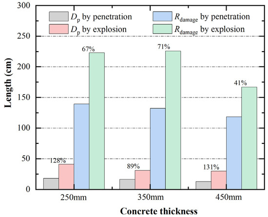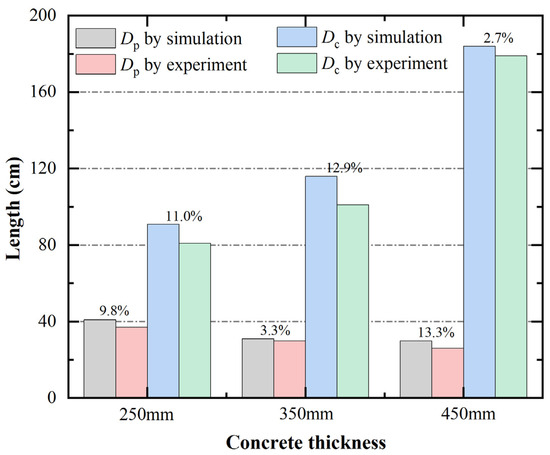 The comparison between the numerical simulation results and the experimental results is shown in Figure 22, and the error values are shown in Table 10. It was indicated that the maximum error for the Dp is 13.3%, and for the Dc is 12.9%. By taking the numerical simulation results from Figure 20, the diameter of the damage zone where Damage = 1 was Rdamage. The comparison of the penetration hole diameters Dp and the damage zone diameters Rdamage between the numerical simulations of the reactive jet penetration and explosion-enhanced damage, as depicted in Figure 23, showed that under the dynamic damage from explosion enhancement, the central penetration diameter Dp increased by an average of 116% and the damage zone diameter Rdamage increased by an average of 59.7%.