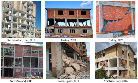 In accordance with the American Society of Civil Engineers (ASCE) [1], infill walls are typically classified as non-structural elements, playing a secondary role in several building types. These non-structural walls have found widespread application in residential, office, commercial, and other construction projects. Despite their common use, past seismic events have highlighted the vulnerability of infill walls under seismic loading conditions, as depicted in Figure 1, showcasing instances of damaged infilled walls. The repercussions extend beyond seismic events, impacting the overall structural behavior of buildings. In addition to seismic vulnerability, infill walls cause adverse structural effects, such as reduced natural periods [2,3], shear fractures in connections [4], the formation of short columns susceptible to shear loads [5,6], and the creation of soft stories [7,8]. In recognizing these shortcomings, researchers have sought novel methods to mitigate the undesirable impacts of infill walls on structural behavior [9].
