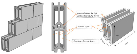 As illustrated in Figure 3, the proposed wall design boasts simplicity in its fabrication. The horizontal interlocking of blocks is anticipated to establish a robust connection, fortifying the joints against lateral loading. This secure joint minimizes the vulnerability of both mortar and adhesive connections to fire damage, ensuring the wall remains structurally stable and does not succumb to its weight during a fire event. Furthermore, owing to the lightweight nature of these concrete blocks, the constructed walls are categorized as lightweight walls. The blocks, consisting of three layers, contribute to the enhanced thermal and acoustic insulation of the wall, along with increased resistance to fire. The incorporation of waste glass powder in the block manufacturing process is pivotal to these improvements. When exposed to high temperatures, the glass powder undergoes melting, augmenting the overall strength of the wall. It is crucial to note that this paper considers the glass-to-cement ratio as a significant parameter in achieving optimal results. Beyond the technical enhancements to wall behavior, the utilization of waste glass aligns with environmental considerations. Glass, being a non-degradable material in nature, is deemed environmentally harmful. The incorporation of waste glass into the construction process not only improves the wall’s performance but also aids in the removal of this non-degradable material from the environment, contributing positively to environmental sustainability [30,31,32,33,34]. No special technology is needed to produce these types of blocks. First, the combined materials are poured into framework blocks. Then, the concrete curing is carried out the same as the lightweight blocks.
