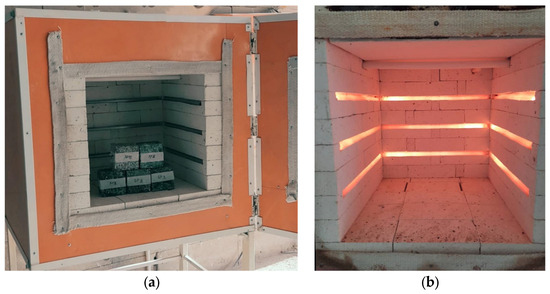 To determine the compressive strength, the average of results from three standard cylinder specimens was utilized. The specimens underwent testing at temperatures of 20 °C, 200 °C, 400 °C, 600 °C, and 900 °C, amounting to a total of 60 models tested at each temperature. With evaluations conducted under five temperature conditions (Tu), a comprehensive set of 300 specimens was tested to determine the optimal mix design for the materials. Figure 5 provides an overview of the test setup and equipment used in the experimental study. The curing process was carried out under laboratory conditions, and all specimens were tested after 28 days. Before applying the compressive load, temperature control was meticulously managed using an automatic oven, as depicted in Figure 6. This controlled heating regime ensured consistent and accurate temperature conditions during the testing process.