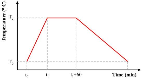 As depicted in Figure 7, the specified temperature regime outlined in the preceding section was applied to the specimens. The notation T0 denotes the ambient temperature. The figure illustrates the time intervals (t1) corresponding to specific temperature points: 20 min for t1 = 20 °C, 20 min for t1 = 200 °C, 65 min for t1 = 400 °C, 105 min for t1 = 600 °C, and 155 min for t1 = 900 °C.