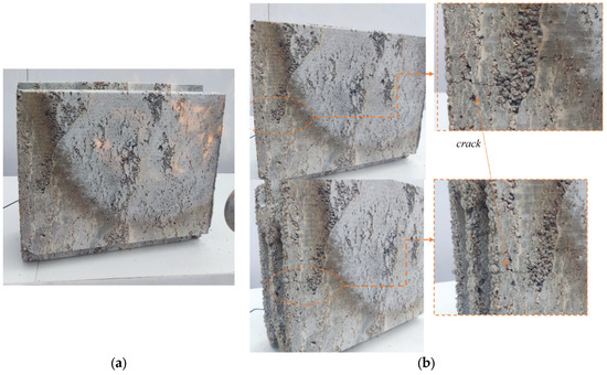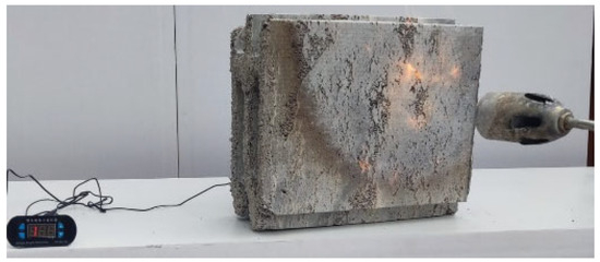 To assess the impact of direct fire exposure on the blocks, a series of tests were conducted, as depicted in Figure 8. The blocks were subjected to direct fire for approximately one hour. The primary objective of the test was to evaluate the block’s response when one side was exposed to fire. The results aim to determine whether the block can withstand the effects of fire and whether it exhibits heat transmission or resistance, as elaborated upon in the subsequent sections.