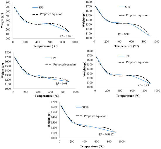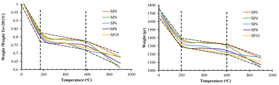 As illustrated in Figure 10, the weight loss of all specimens can be characterized by three distinct segments: the first segment corresponding to , the second segment encompassed by , and the third stage pertaining to . In the first segment, the maximum weight loss was observed, followed by a relatively minor weight loss in the second segment. In the third segment, although weight loss was still evident, the rate of decline was less pronounced compared to the first segment. Referring to Figure 10, the weight loss reached 0.81, ranged from 0.73 to 0.76, and ranged from 0.68 to 0.61 in the first, second, and third segments, respectively. Additionally, it is noteworthy that SP8 exhibited the maximum weight loss among the specimens.