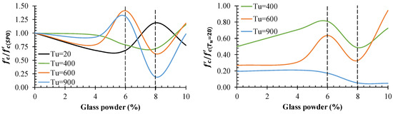 - At Tu = 200 °C, glass powder less than 4% reduced the , and in glass powder ranging from 4% to 8%, it increased the . Therefore, the optimal volume of glass powder was measured as 6% for specimens under different temperatures.